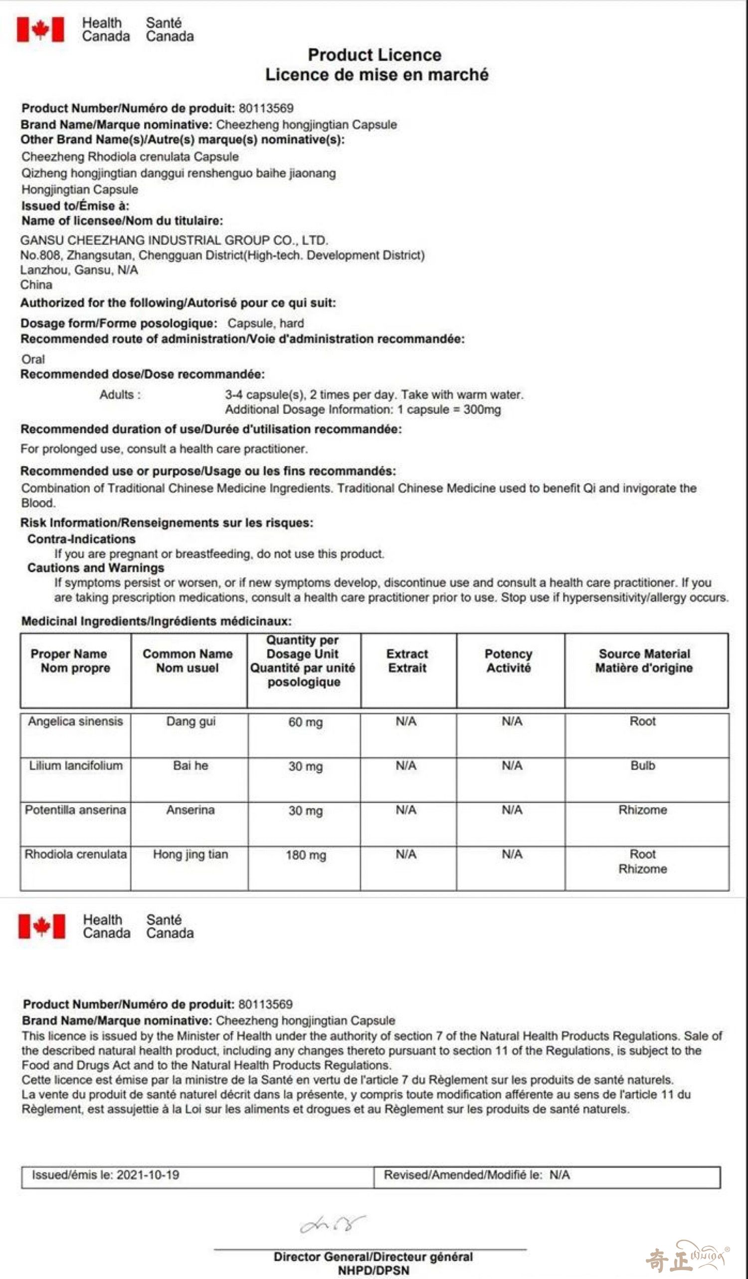 加拿大GMP證書-奇正紅景天當(dāng)歸人參果百合膠囊