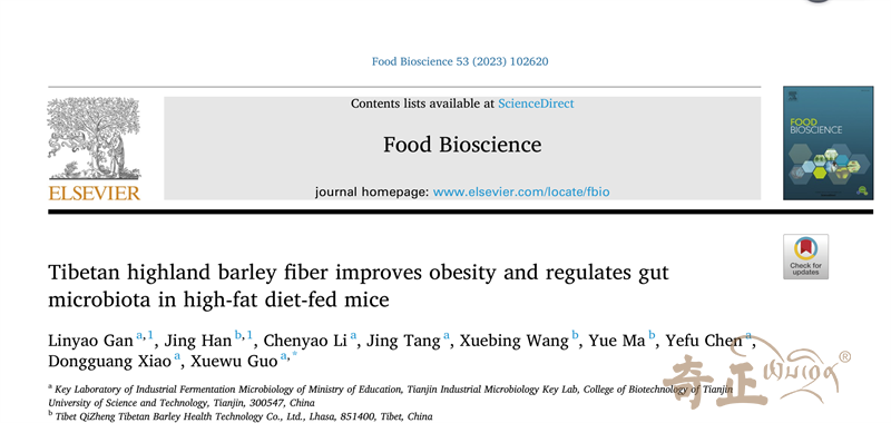 第一篇論文題目為《Tibetan highland barley fiber improves obesity and regulates gutmicrobiota in high-fat diet-fed mice》(西藏青稞高纖粉改善高脂飲食小鼠的肥胖以及腸道菌群),與天津科技大學(xué)合作發(fā)表在《Food Bioscience》 ,2022年度影響因子5.318。
