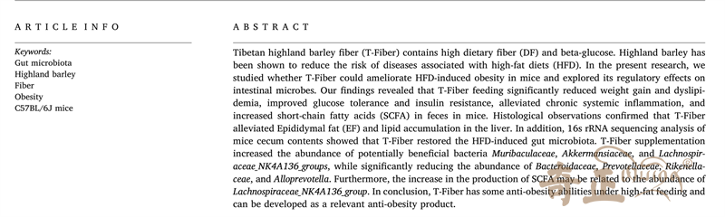 青稞高纖粉(T-fiber)含有較高的膳食纖維(DF)和β-葡萄糖。青稞已被證明可以降低與高脂肪飲食(HFD)相關(guān)的疾病風(fēng)險(xiǎn)。這篇論文主要研究了西藏青稞高纖粉(T-fiber)是否能改善HFD誘導(dǎo)的小鼠肥胖,并探討了其對腸道微生物的影響。結(jié)果表明,青稞高纖粉(T-fiber)喂養(yǎng)能夠顯著減少小鼠體重增加、改善葡萄糖耐量和胰島素抵抗、緩解慢性全身炎癥,同時(shí)小鼠糞便中短鏈脂肪酸(SCFA)也有增加。總之,青稞高纖粉(T-fiber)具有一定的抗肥胖能力,可以作為相關(guān)的抗肥胖產(chǎn)品來進(jìn)行開發(fā)。