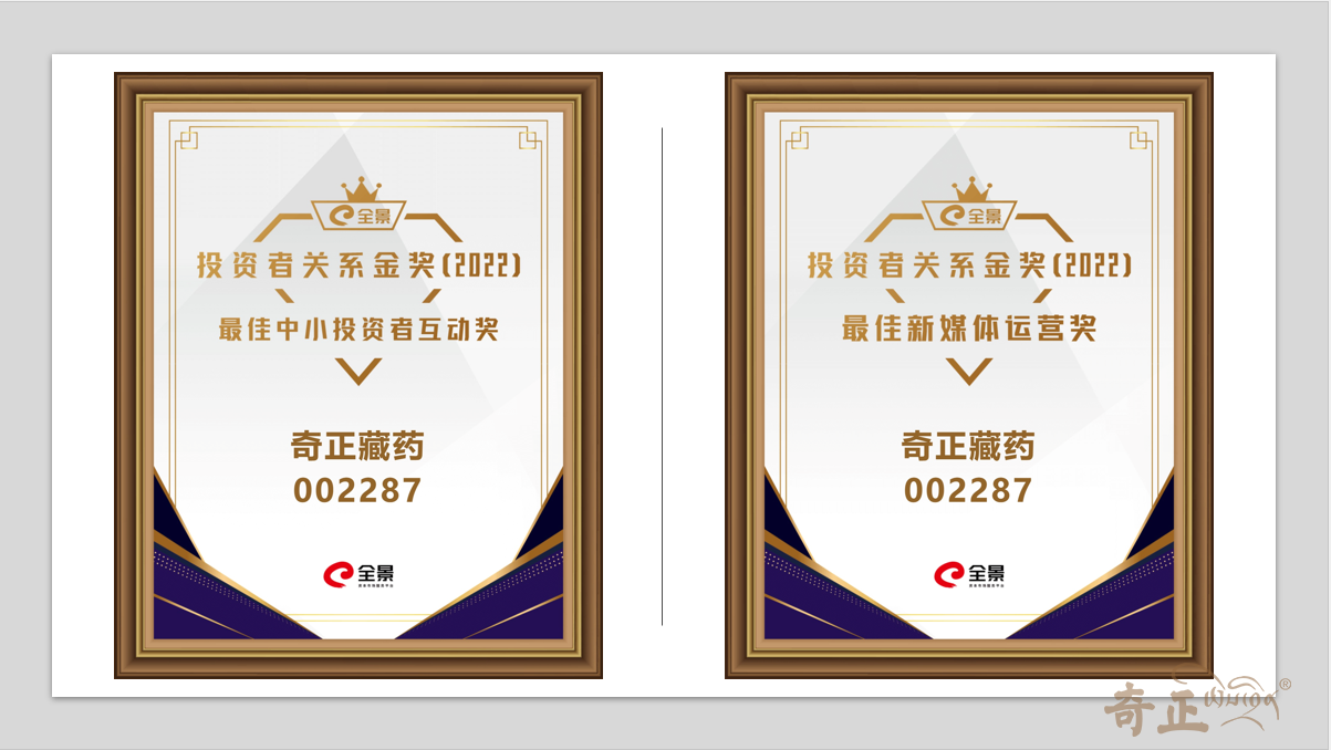 5月23日,“全景投資者關(guān)系金獎(jiǎng)”2022年度全國性評選的獲獎(jiǎng)榜單正式揭曉,奇正藏藥喜提“最佳中小投資者互動(dòng)獎(jiǎng)”、“最佳新媒體運(yùn)營獎(jiǎng)”兩項(xiàng)殊榮。