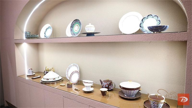 古絲綢之路,陶瓷是主角之一。陶瓷也是一種有著傳統(tǒng)審美延續(xù)的載體。九色鹿鳴瓷器《印象敦煌》系列中,茶咖杯型制采自唐代仕女狩獵紋八瓣銀杯以及鎏金蓮瓣紋銀高足杯;糖盒以唐代十二瓣形毌子扣合之南瓜形盒為范,就連頂上南瓜連梗,也是小心汲取了十二瓣凸起如意形蓮瓣圍繞瓜梗;一把湯羹勺,可看出唐代鎏金鏨花九曲銀勺的端倪;碗,是唐代鎏金海獸水波紋銀碗之樣。餐盤以及一些杯碟的紋飾,有著優(yōu)美的名字:石榴卷草紋、纏枝茶花卷草紋、蓮花紋等等,分別來自莫高窟壁畫中繁縟莊重的藻井、佛頭光、蓮花寶座和平棋。