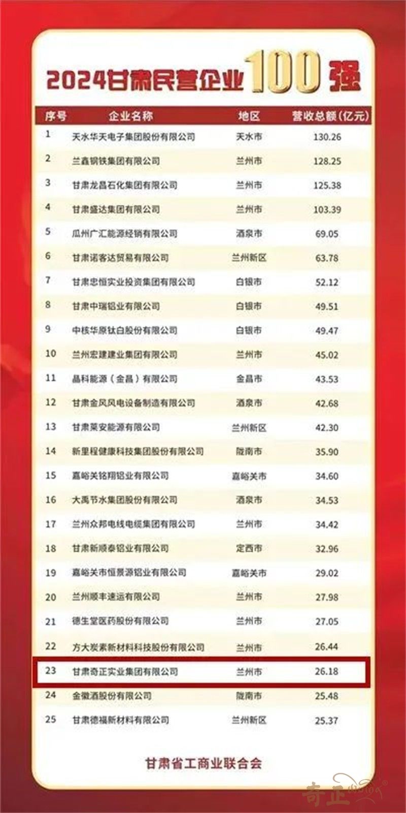 日前,2024 甘肅民營企業(yè) 100 強(qiáng)發(fā)布會暨“民營企業(yè)進(jìn)邊疆”活動在酒泉隆重舉行。甘肅奇正實(shí)業(yè)集團(tuán)有限公司憑借其卓越的經(jīng)營業(yè)績和穩(wěn)健的發(fā)展態(tài)勢,榮膺100強(qiáng)榜單第23位。