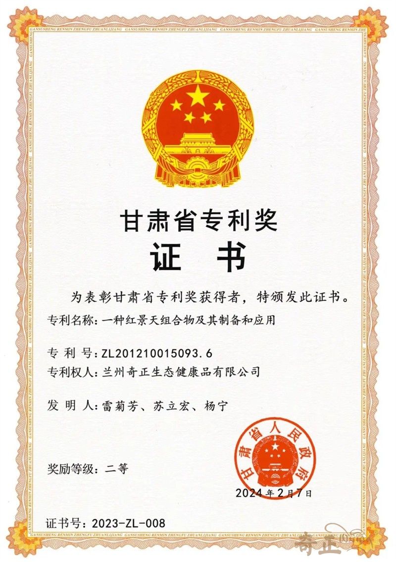 2024年2月7日,甘肅省人民政府發(fā)布《關(guān)于2023年度甘肅省專利獎獎勵的決定》,奇正健康發(fā)明專利:“一種紅景天組合物及其制備和應(yīng)用”憑借其獨(dú)特的價(jià)值與技術(shù)優(yōu)勢,在眾多參評項(xiàng)目中脫穎而出,榮獲2023年度甘肅省專利獎二等獎。