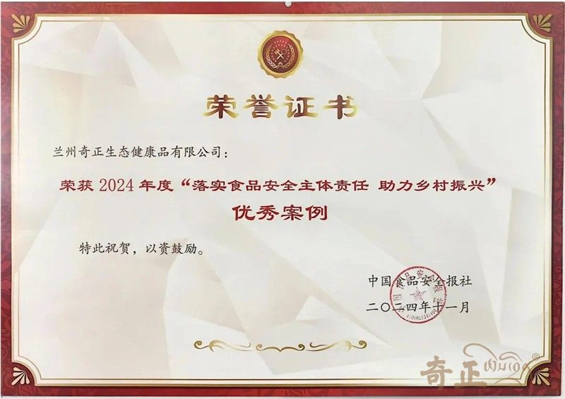2024年11月3日,第十一屆全國食品安全監(jiān)管信息工作交流大會暨全國食品產(chǎn)業(yè)高質(zhì)量發(fā)展(甘肅)大會在蘭州舉行。奇正健康榮獲2024年度“落實(shí)食品安全主體責(zé)任 助力鄉(xiāng)村振興”優(yōu)秀案例。