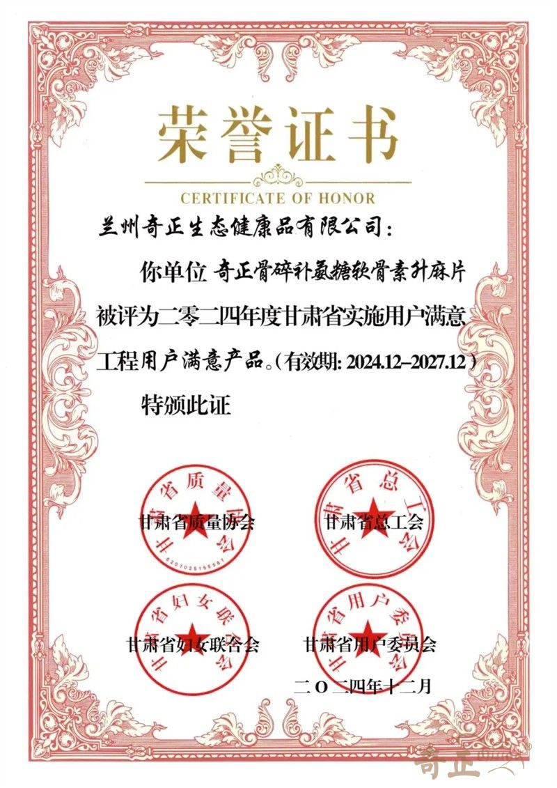 2024年12月,甘肅省質(zhì)量協(xié)會、甘肅省總工會、甘肅省婦女聯(lián)合會及甘肅省用戶委員會聯(lián)合發(fā)布《2024年度甘肅省實(shí)施用戶滿意工程先進(jìn)單位及個人的通知》。奇正健康旗下明星產(chǎn)品“奇正?骨碎補(bǔ)氨糖軟骨素升麻片”一舉摘得“用戶滿意產(chǎn)品”榮譽(yù)稱號。這是繼“奇正?紅景天當(dāng)歸人參果百合膠囊”后,奇正健康保健食品再次獲得此項(xiàng)殊榮。該榮譽(yù)的獲得也是對公司產(chǎn)品和服務(wù)的高度認(rèn)可和肯定。