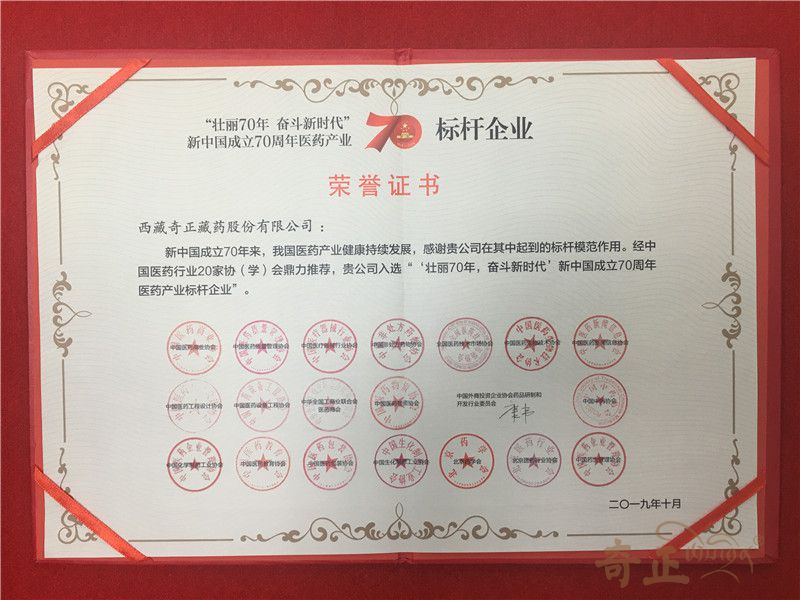 “壯麗70年 奮斗新時(shí)代”新中國成立70周年醫(yī)藥產(chǎn)業(yè)-標(biāo)桿企業(yè)-2019年10月證書