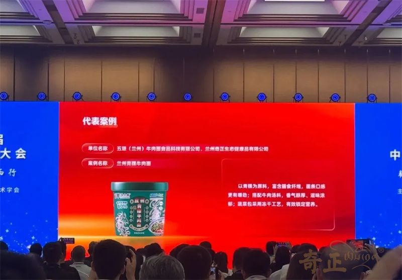 在大會代表案例展示中,由奇正生態(tài)健康品有限公司生產(chǎn)的蘭州青稞牛肉面榮登“2024—2025年度中國方便食品行業(yè)科技與產(chǎn)業(yè)創(chuàng)新新趨勢代表案例”,該產(chǎn)品以青稞為原料,富含膳食纖維,面條口感更有嚼勁;搭配牛肉湯料,香氣醇厚、滋味濃郁;蔬菜包采用凍干工藝,有效鎖定營養(yǎng)。和傳統(tǒng)牛肉面相比,青稞牛肉面中青稞含量高達(dá)80%,膳食纖維和β- 葡聚糖含量更高,且青稞面餅非油炸,相對更健康。